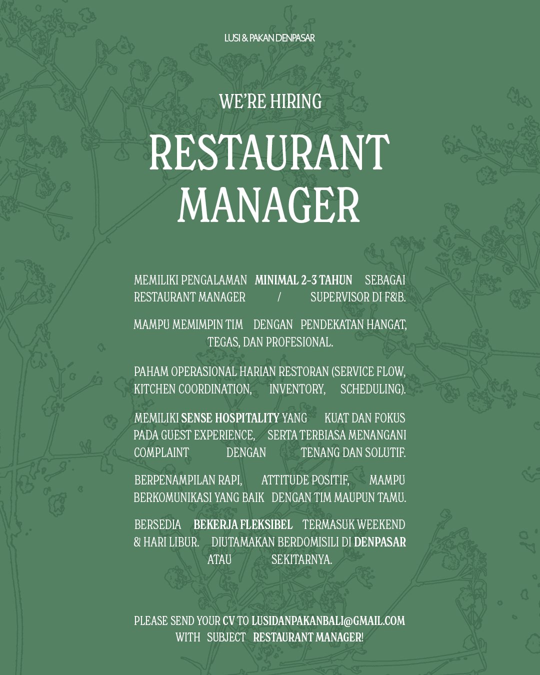 Bagi Anda yang memenuhi kriteria tersebut dan ingin berkembang bersama Lusi & Pakan, segera kirimkan Curriculum Vitae (CV) terbaru Anda melalui email ke lusidanpakanbali@gmail.com. Jangan lupa untuk mencantumkan subjek email: RESTAURANT MANAGER! guna memudahkan proses administrasi oleh tim rekrutmen. Ini adalah kesempatan bagi Anda untuk menunjukkan dedikasi dalam menciptakan standar pelayanan restoran yang unggul di jantung kota Denpasar.