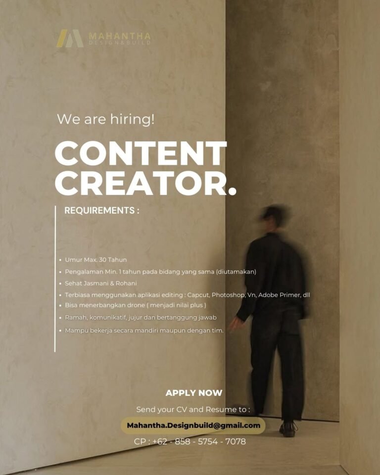 LOKER.BALINEWS.ID, BALI – Perusahaan yang bergerak di bidang arsitektur dan konstruksi, Mahantha Design & Build, saat ini sedang membuka kesempatan karier bagi para profesional muda di Bali. Terdapat dua posisi strategis yang dibutuhkan segera, yakni Pelaksana Proyek dan Content Creator. Untuk posisi Pelaksana Proyek, perusahaan mencari kandidat lulusan S1 Teknik Sipil yang memahami sistem kerja konstruksi serta mampu menyusun laporan progres pekerjaan dengan akurat. Sementara itu, posisi Content Creator diperuntukkan bagi mereka yang kreatif dan mahir mengoperasikan aplikasi editing seperti Capcut, Photoshop, hingga Adobe Premiere.