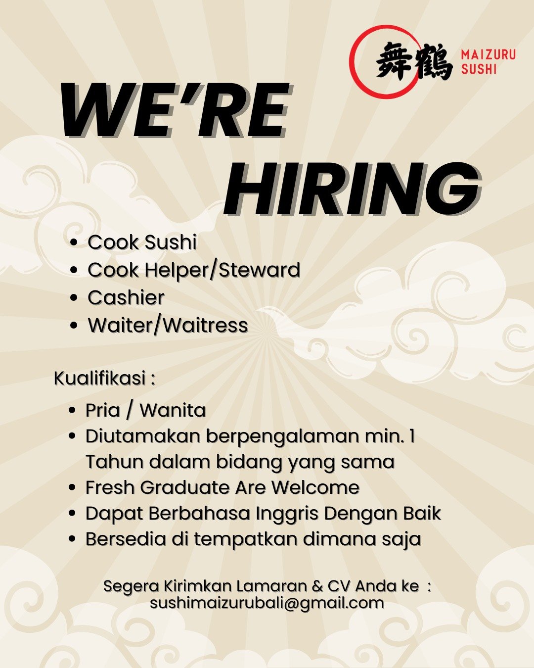 Kirimkan lamaran & CV ke: sushimaizurubali@gmail.com
