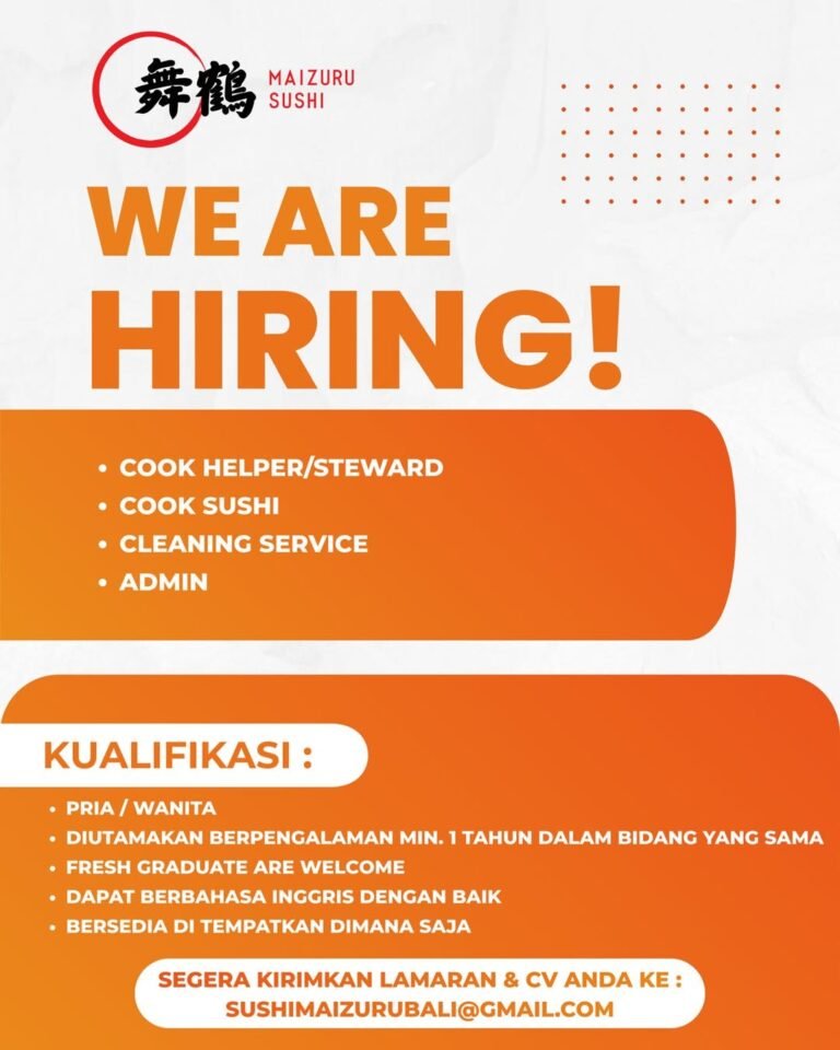 LOKER.BALINEWS.ID, BALI – Maizuru Sushi, salah satu unit usaha kuliner yang menyajikan hidangan khas Jepang, saat ini tengah melakukan rekrutmen besar-besaran untuk memperkuat tim operasional mereka. Perusahaan membuka kesempatan karir bagi masyarakat Bali untuk mengisi berbagai posisi strategis, mulai dari lini dapur hingga administrasi. Adapun posisi yang ditawarkan meliputi Cook Sushi, Cook Helper/Steward, Cleaning Service, serta Admin.
