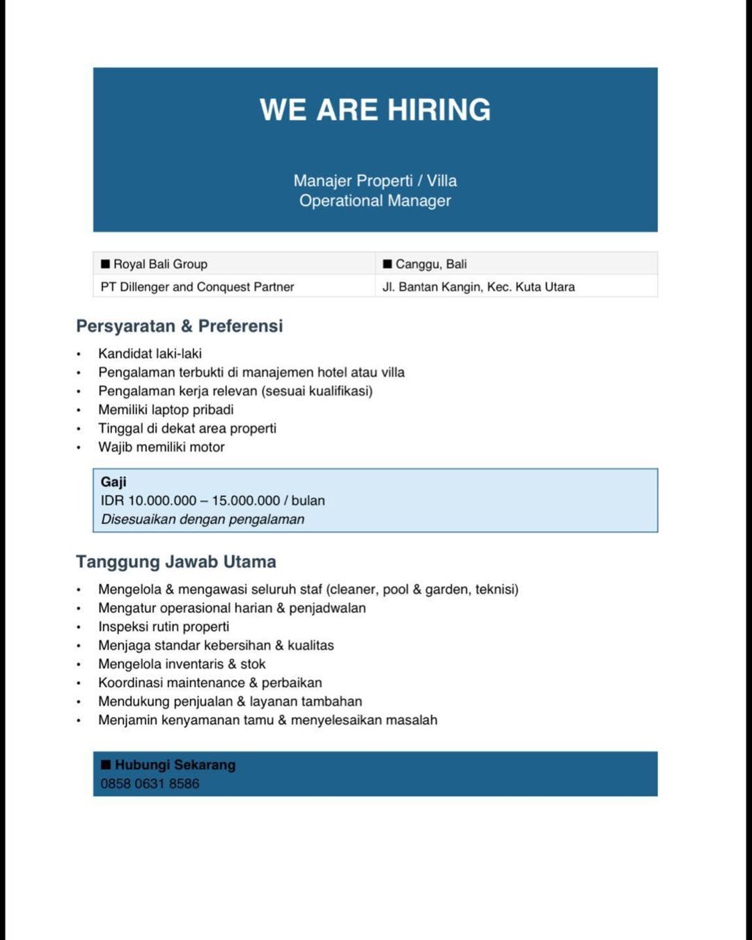 LOKER.BALINEWS.ID, BADUNG – Royal Bali Group melalui PT Dillenger and Conquest Partner saat ini membuka lowongan kerja Bali untuk posisi Manajer Properti / Villa Operational Manager yang akan ditempatkan di area Canggu, Kuta Utara, Kabupaten Badung. Posisi ini ditujukan bagi kandidat laki-laki yang memiliki pengalaman terbukti di bidang manajemen hotel atau villa serta mampu mengelola operasional properti secara menyeluruh.