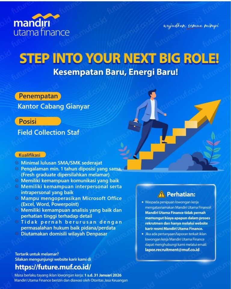LOKER.BALINEWS.ID, GIANYAR – Mandiri Utama Finance (MUF), perusahaan pembiayaan kendaraan bermotor yang merupakan bagian dari grup usaha bank milik negara, saat ini tengah membuka peluang karir sebagai Field Collection Staff. Posisi ini diperuntukkan bagi penempatan di Kantor Cabang Denpasar guna memperkuat tim operasional dalam mengelola portofolio pembiayaan di wilayah tersebut. MUF mencari kandidat yang memiliki kemampuan komunikasi, interpersonal, serta intrapersonal yang baik untuk berinteraksi dengan pelanggan secara profesional.
