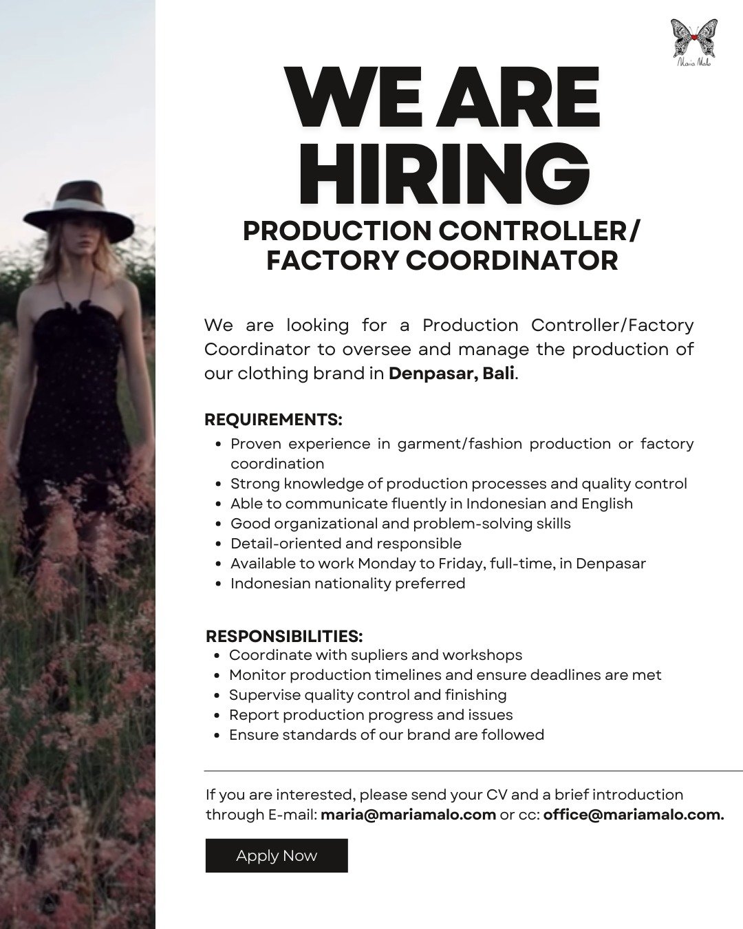 Tanggung jawab utama posisi ini meliputi koordinasi dengan pemasok dan bengkel produksi, memantau linimasa agar target waktu terpenuhi, serta melakukan supervisi langsung terhadap kontrol kualitas dan penyelesaian produk (finishing). Bagi Anda yang berminat dan memenuhi kualifikasi, silakan mengirimkan Curriculum Vitae (CV) beserta perkenalan singkat melalui email ke maria@mariamalo.com atau ke alamat email cadangan di office@mariamalo.com.
