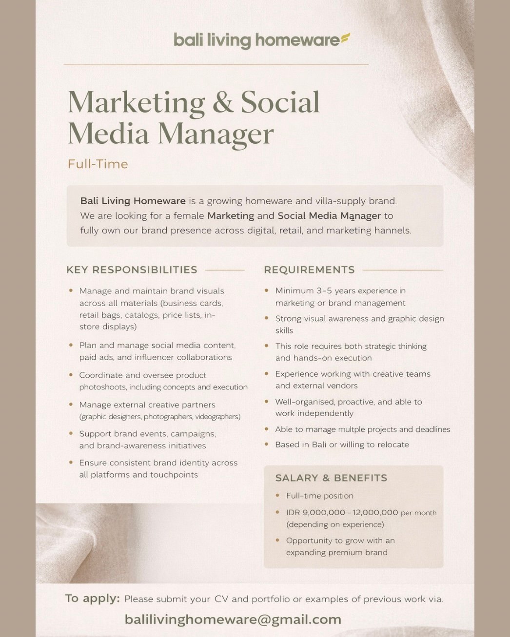 LOKER.BALINEWS.ID, BALI — Bali Living Homeware, brand perlengkapan rumah dan villa-supply yang terus berkembang, membuka lowongan untuk posisi Marketing & Social Media Manager (Full Time). Perusahaan mencari kandidat perempuan yang mampu mengelola identitas merek secara menyeluruh — mulai dari digital, retail, hingga aktivitas marketing.