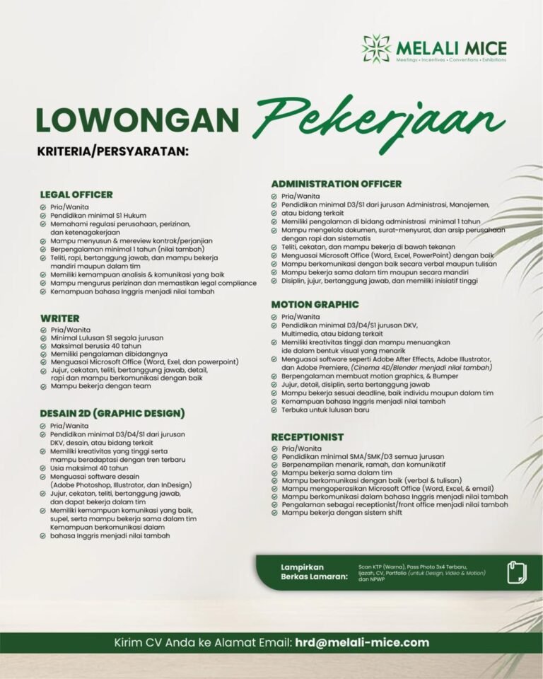 LOKER.BALINEWS.ID, DENPASAR — Melali MICE membuka kesempatan kerja untuk beberapa posisi sekaligus di industri Meetings, Incentives, Conventions & Exhibitions. Posisi yang tersedia antara lain: Legal Officer, Writer, Desain 2D/Graphic Design, Administration Officer, Motion Graphic, dan Receptionist.