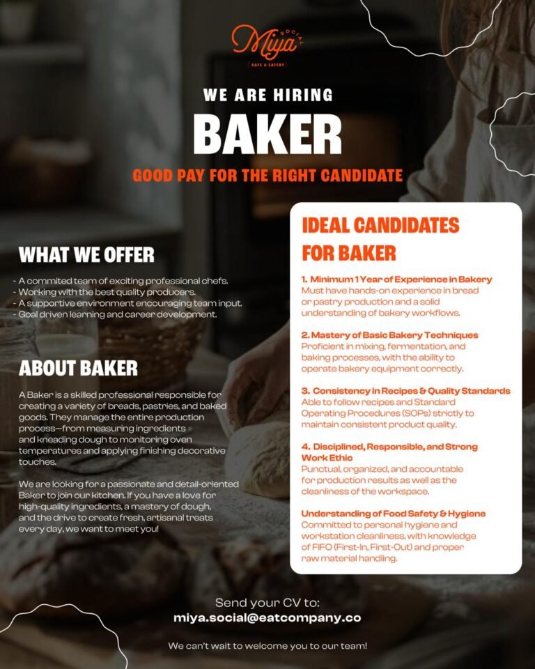 Kandidat yang ideal setidaknya memiliki pengalaman minimal satu tahun di bidang bakery dengan penguasaan teknik dasar seperti pencampuran, fermentasi, dan pengoperasian peralatan bakery. Selain kemampuan teknis, perusahaan menekankan pentingnya disiplin, tanggung jawab, serta pemahaman mendalam mengenai standar kebersihan makanan (HACCP) dan sistem FIFO. Miya menjanjikan paket gaji yang menarik serta lingkungan kerja yang mendukung pengembangan karir bagi kandidat yang tepat. Jika Anda merasa memenuhi kualifikasi tersebut, silakan kirimkan CV terbaru Anda melalui email ke miya.social@eatcompany.co.