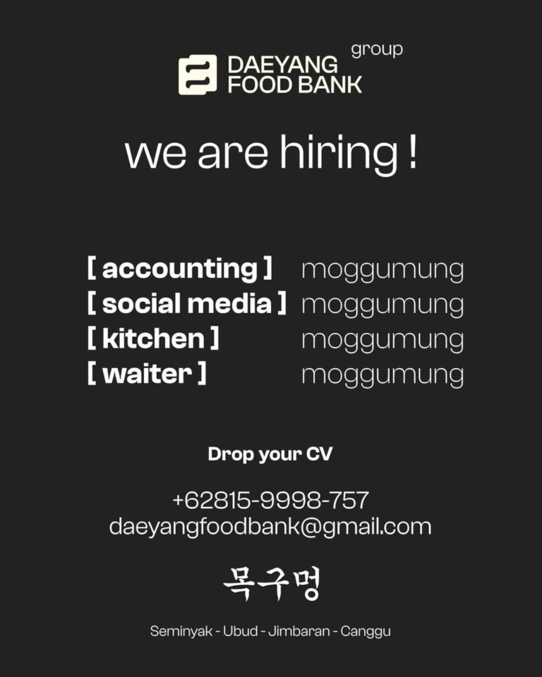 Bagi Anda yang memiliki kualifikasi sesuai, aplikasi dapat dikirimkan langsung melalui WhatsApp di nomor +62815-9998-757 atau melalui email resmi di daeyangfoodbank@gmail.com. Jangan lewatkan kesempatan untuk berkarir di salah satu grup kuliner yang memiliki jaringan luas di Seminyak, Ubud, Jimbaran, hingga Canggu ini. Segera kirimkan CV terbaru Anda sebelum posisi terpenuhi.