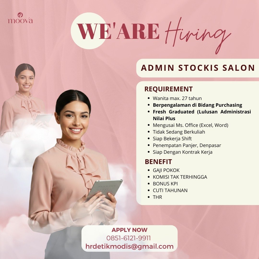 LOKER.BALINEWS.ID, DENPASAR – Industri kecantikan di wilayah Denpasar kembali membuka peluang karier menarik bagi para pencari kerja. Moova Hair & Beauty, yang berlokasi di kawasan Panjer, saat ini sedang mencari talenta-talenta berbakat untuk mengisi tiga posisi sekaligus, yaitu Capster, Admin Stockist Salon, dan Front Office. Lowongan ini terbuka bagi pria maupun wanita dengan batasan usia tertentu sesuai posisi yang dilamar, serta memberikan kesempatan bagi lulusan baru (fresh graduate) untuk bergabung dan berkembang bersama tim.