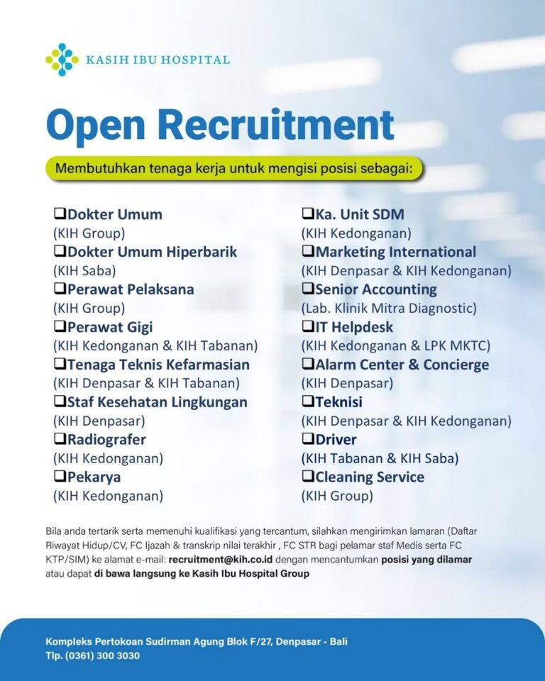 LOKER.BALINEWS.ID, DENPASAR – Kasih Ibu Hospital Group, salah satu jaringan penyedia layanan kesehatan terkemuka di Bali, kembali membuka kesempatan karir besar-besaran melalui program Open Recruitment. Perusahaan sedang mencari tenaga kerja profesional untuk mengisi berbagai posisi strategis di beberapa cabang mereka, mulai dari tenaga medis hingga staf operasional pendukung guna meningkatkan kualitas pelayanan kesehatan di wilayah Bali.