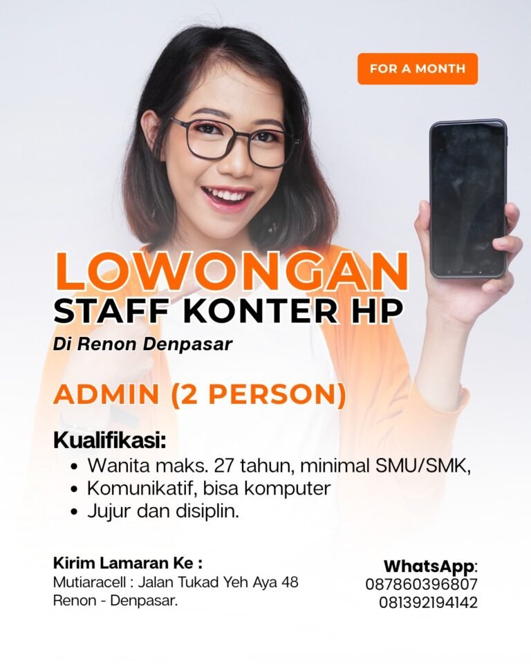 LOKER.BALINEWS.ID, DENPASAR – Mutiara Cell, salah satu penyedia layanan telekomunikasi yang berlokasi di kawasan strategis Renon, saat ini sedang membuka kesempatan berkarir bagi tenaga kerja muda untuk mengisi posisi Staff Konter HP dan Admin. Lowongan ini dibuka untuk memenuhi kebutuhan operasional toko selama satu bulan ke depan dengan mencari dua orang kandidat yang kompeten di bidangnya. Penempatan kerja akan difokuskan di gerai Mutiara Cell yang beralamat di Jalan Tukad Yeh Aya No. 48, Renon, Denpasar.