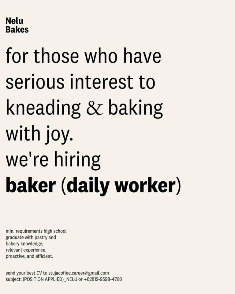Kandidat yang dicari minimal merupakan lulusan SMA/SMK sederajat yang memiliki pengetahuan dasar di bidang pastry dan bakery. Selain itu, pihak manajemen mengutamakan pelamar yang memiliki pengalaman relevan, bersikap proaktif, serta mampu bekerja secara efisien di dapur. Bagi Anda yang memenuhi kriteria tersebut, segera kirimkan CV terbaik Anda melalui email ke stujacoffee.career@gmail.com dengan subjek (POSITION APPLIED)_NELU, atau melalui kontak WhatsApp di nomor +62812-9598-4768.