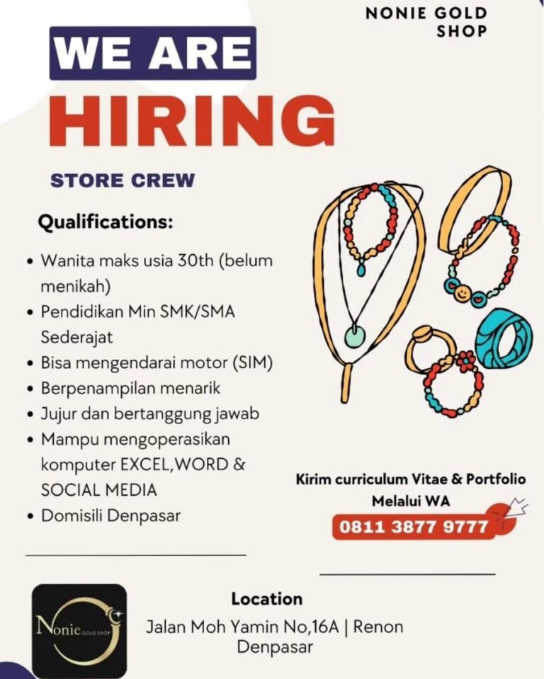LOKER.BALINEWS.ID, DENPASAR – Nonie Gold Shop, sebuah toko perhiasan yang berlokasi di kawasan Renon, Denpasar, saat ini sedang mencari tenaga kerja baru untuk memperkuat tim operasional mereka. Toko tersebut secara resmi membuka lowongan pekerjaan untuk posisi Store Crew bagi individu yang berdomisili di Denpasar dan sekitarnya.