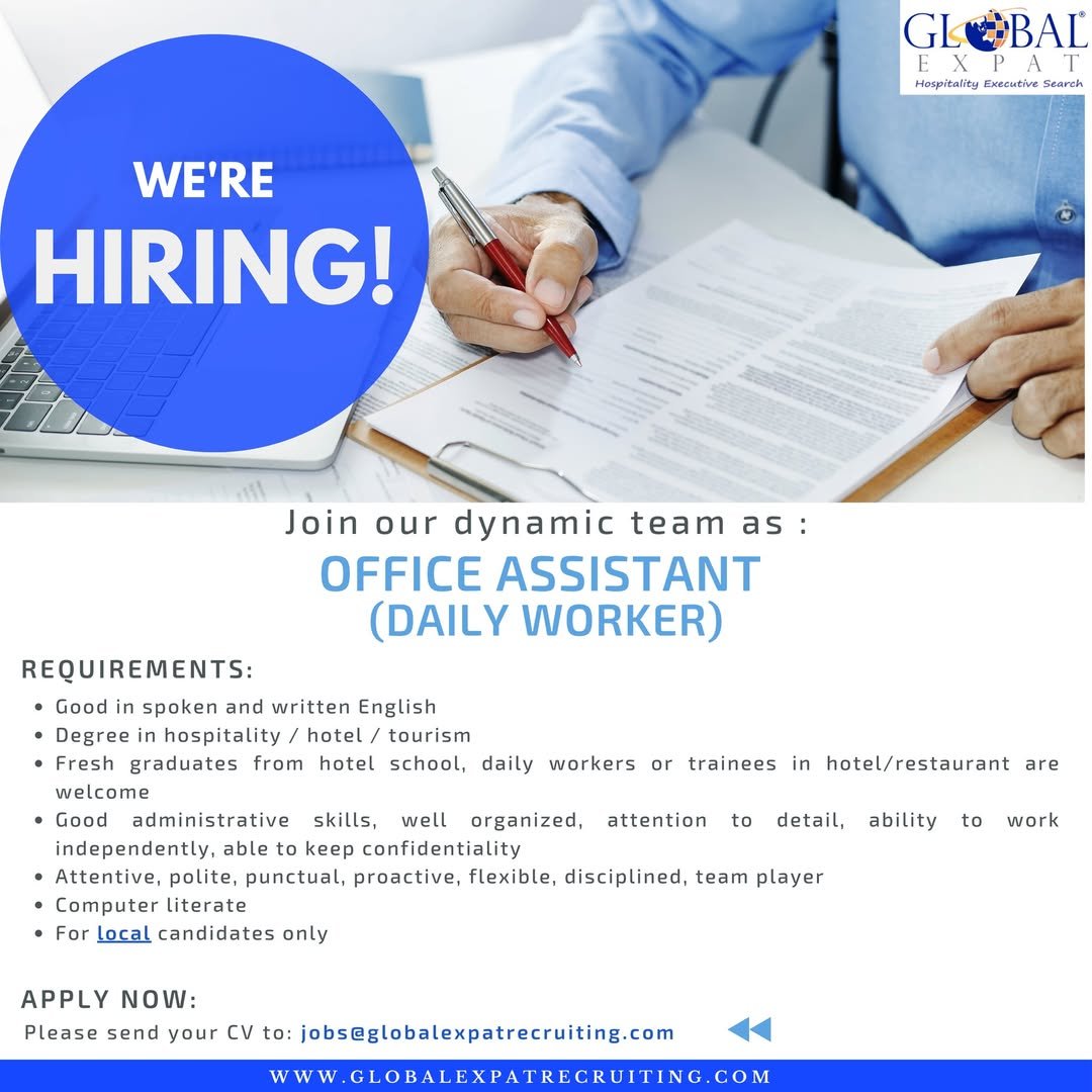 LOKER.BALINEWS.ID, DENPASAR — Global Expat membuka Lowongan Kerja Bali Office Assistant Daily Worker bagi kandidat lokal yang memiliki kemampuan bahasa Inggris baik, tertulis maupun lisan. Posisi ini terbuka untuk lulusan jurusan hospitality, hotel, atau pariwisata, termasuk fresh graduate, trainee, maupun kandidat dengan pengalaman magang di hotel dan restoran. Perusahaan mencari individu yang teliti, terorganisir, serta mampu menjaga kerahasiaan data kantor.