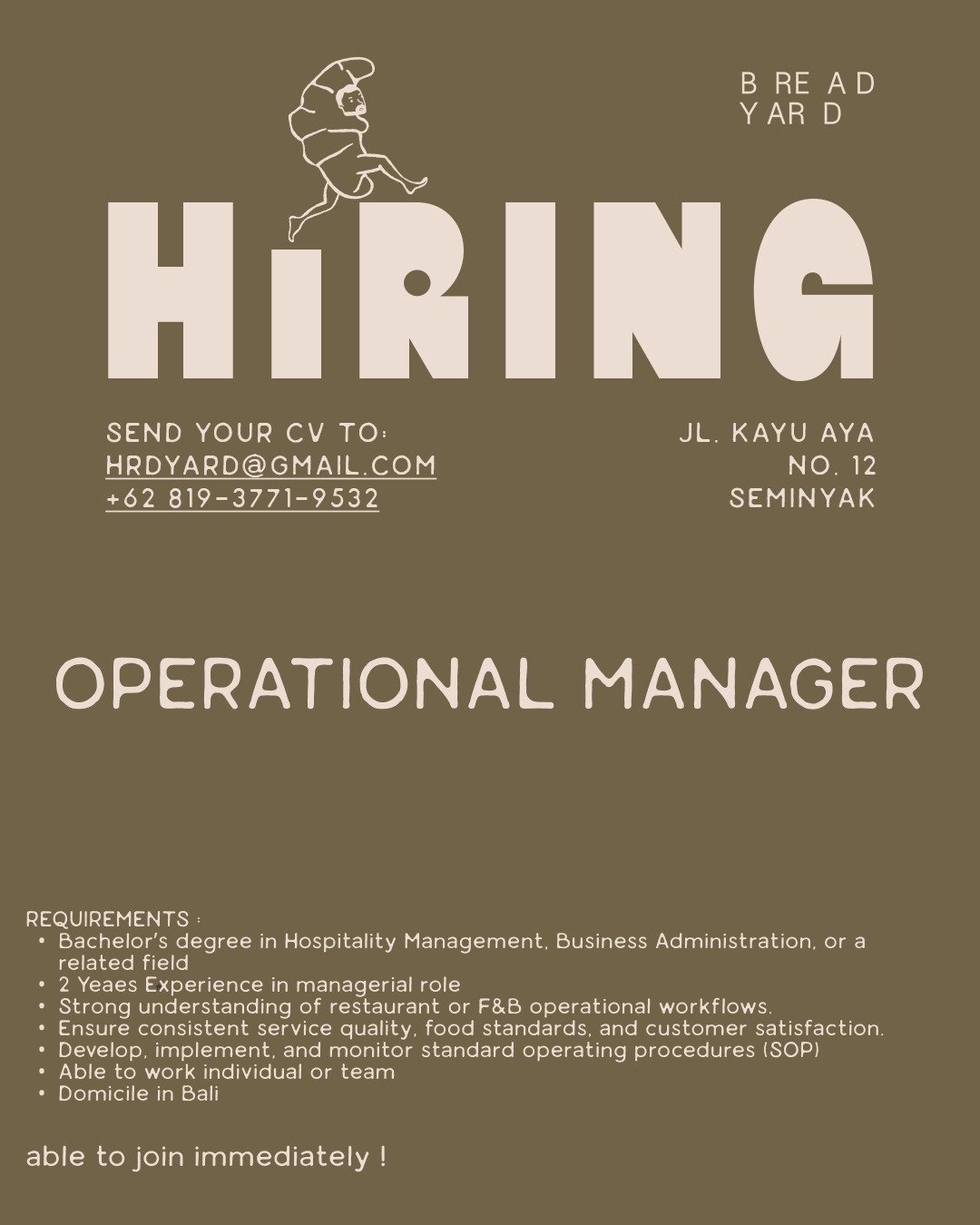 LOKER.BALINEWS.ID, BADUNG — Bread Yard Seminyak membuka Lowongan Kerja Bali Operational Manager Bread Yard bagi kandidat berpengalaman di bidang F&B dan hospitality. Perusahaan mencari profesional yang mampu memimpin operasional, memastikan standar layanan dan kualitas makanan, serta menjaga kepuasan pelanggan. Pelamar diutamakan memiliki gelar di bidang Hospitality Management/Business Administration dan minimal dua tahun pengalaman pada posisi manajerial.
