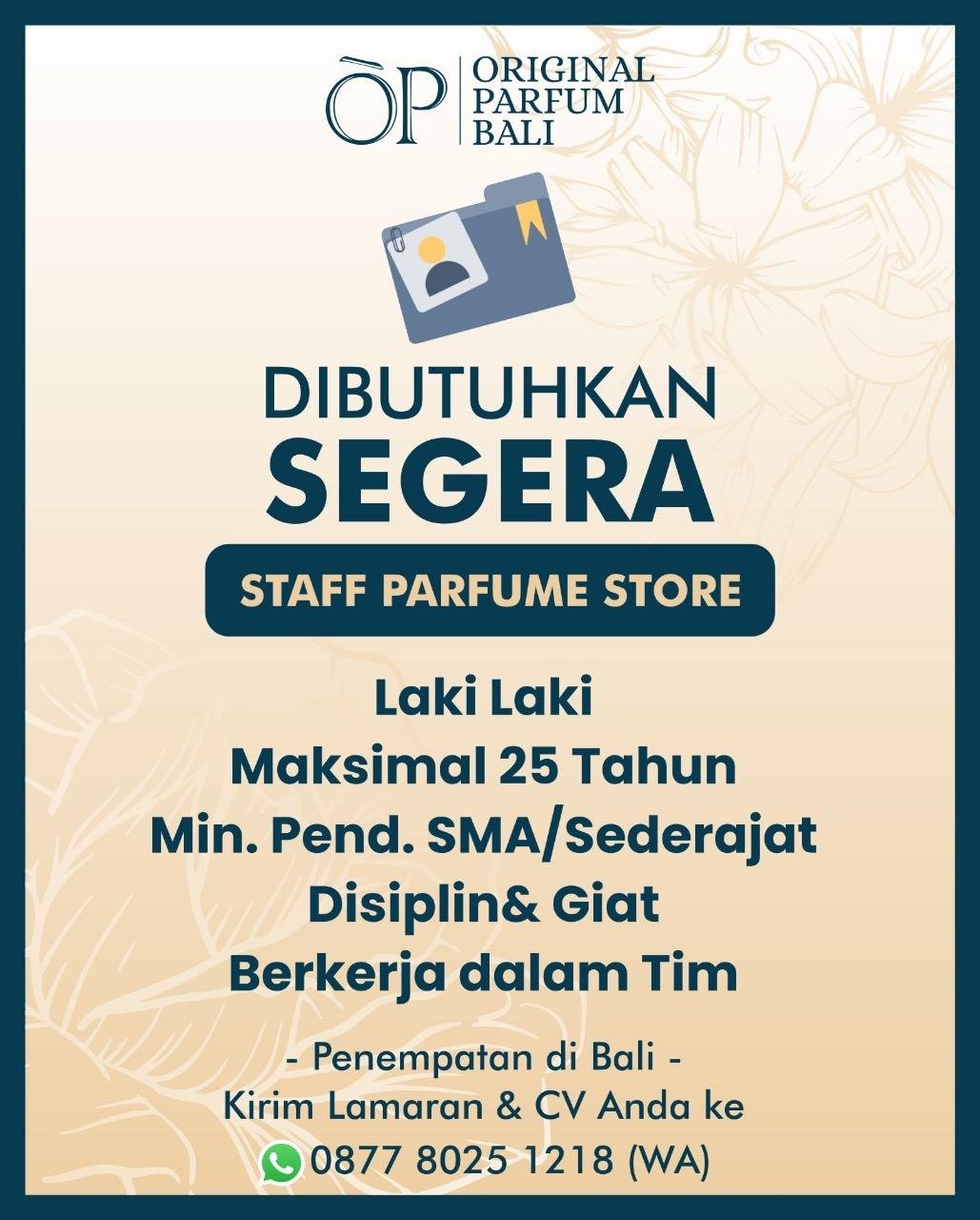 LOKER.BALINEWS.ID, BALI — Original Parfum Bali membuka lowongan kerja untuk posisi Staff Parfume Store. Dibutuhkan kandidat laki-laki, usia maksimal 25 tahun, dengan pendidikan minimal SMA/sederajat.