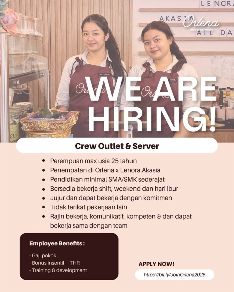 LOKER.BALINEWS.ID, DENPASAR – Orlena, melalui kampanye #LifeAtOrlena, kini mengundang talenta muda di Bali untuk bergabung dalam tim mereka sebagai Crew Outlet & Server. Kesempatan karir purna waktu (full time) ini dibuka untuk penempatan di unit kolaborasi Orlena x Lenora Akasia. Perusahaan mencari individu yang kompeten dan memiliki semangat tinggi untuk memberikan pelayanan terbaik di industri kuliner.