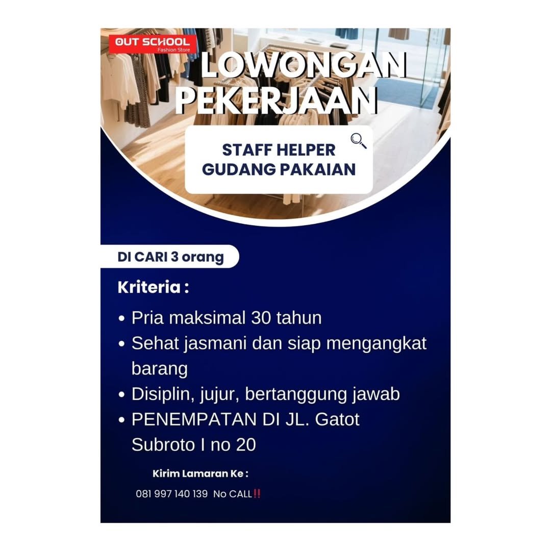 LOKER.BALINEWS.ID, DENPASAR – Out School Fashion Store kembali membuka kesempatan berkarir bagi tenaga kerja pria untuk mengisi posisi sebagai Staff Helper Gudang Pakaian. Lowongan ini ditujukan bagi kandidat yang memiliki fisik yang kuat serta sehat jasmani, karena tanggung jawab utama pekerjaan ini melibatkan kesiapan dalam mengangkat barang-barang stok pakaian di gudang. Penempatan kerja untuk posisi ini akan berpusat di lokasi strategis, yaitu Jalan Gatot Subroto I No. 20, Denpasar.