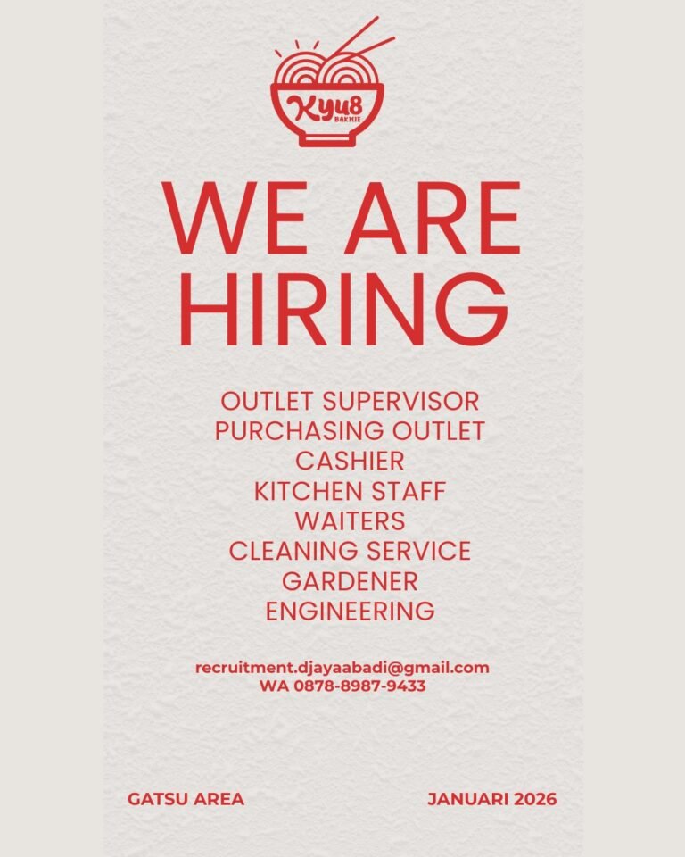LOKER.BALINEWS.ID, DENPASAR — Telah dibuka Lowongan Kerja Bali Outlet Supervisor, Cashier, Kitchen Staff, dan Waiters untuk penempatan area Gatsu, Denpasar. Perusahaan kuliner yang sedang berkembang ini membutuhkan beberapa posisi operasional, antara lain Outlet Supervisor, Purchasing Outlet, Cashier, Kitchen Staff, Waiters, Cleaning Service, Gardener, dan Engineering. Rekrutmen dibuka bagi pelamar yang siap bekerja secara profesional dan memiliki minat pada industri makanan dan minuman.