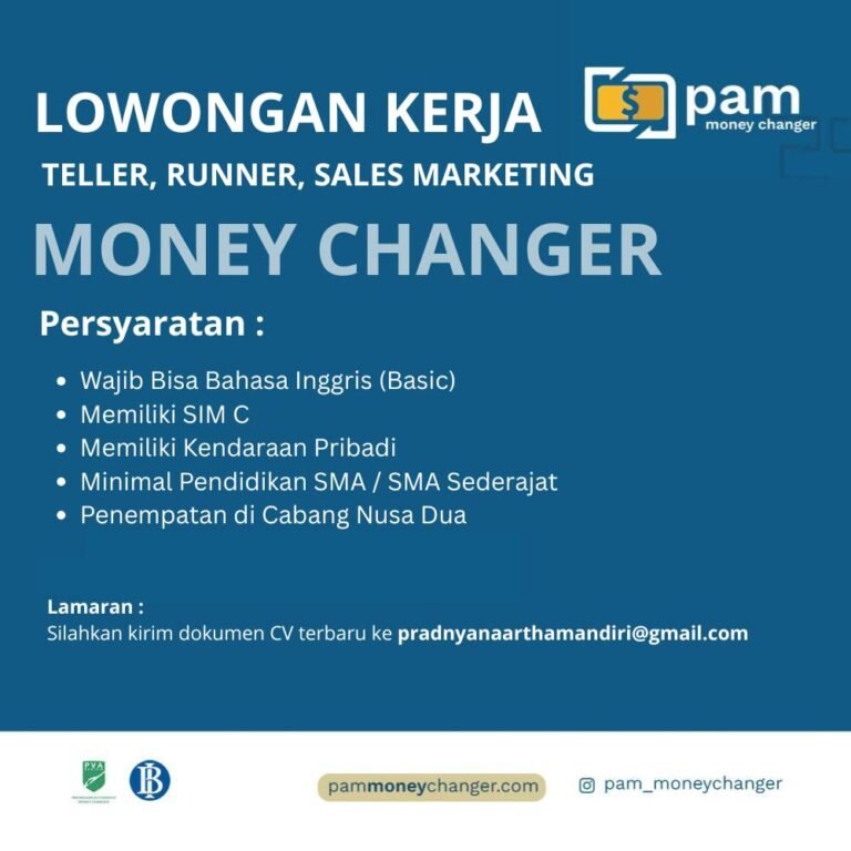 LOKER.BALINEWS.ID, BADUNG – Industri jasa keuangan dan penukaran mata uang asing di Bali terus memperkuat tim operasionalnya, seiring dengan stabilnya arus wisatawan mancanegara. Saat ini, PAM Money Changer mengumumkan pembukaan lowongan pekerjaan untuk tiga posisi sekaligus, yakni Teller, Runner, dan Sales Marketing. Seluruh posisi tersebut akan ditempatkan di cabang strategis mereka yang berlokasi di kawasan Nusa Dua, Kabupaten Badung.