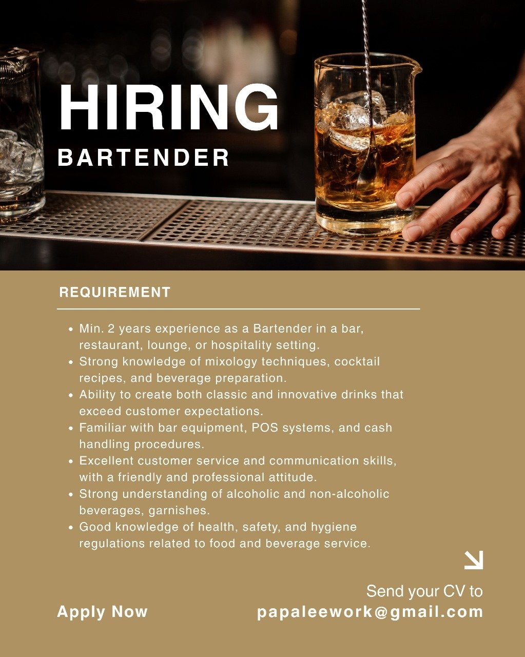 Kandidat yang dicari wajib memiliki pengalaman minimal 2 tahun sebagai Bartender di lingkungan bar, restoran, atau industri hospitality. Selain mahir dalam teknik mixology dan pembuatan berbagai resep koktail, pelamar diharapkan memiliki pengetahuan luas mengenai minuman beralkohol maupun non-alkohol serta hiasannya (garnishes). Kualifikasi tambahan mencakup kemampuan mengoperasikan sistem POS, pemahaman prosedur penanganan kas, serta ketaatan yang ketat terhadap regulasi kesehatan, keselamatan, dan higiene dalam layanan makanan dan minuman.