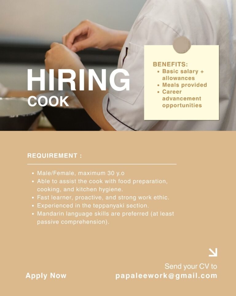 Kandidat yang dicari dapat berasal dari kalangan pria maupun wanita dengan batasan usia maksimal 30 tahun. Persyaratan utama untuk posisi ini meliputi kemampuan membantu koki utama dalam persiapan makanan, proses memasak, serta menjaga higiene dapur. Pelamar diwajibkan memiliki pengalaman di bagian teppanyaki serta memiliki etos kerja yang kuat, proaktif, dan cepat belajar. Selain itu, kemampuan berbahasa Mandarin, setidaknya secara pasif, menjadi nilai tambah yang sangat diutamakan dalam proses seleksi ini.