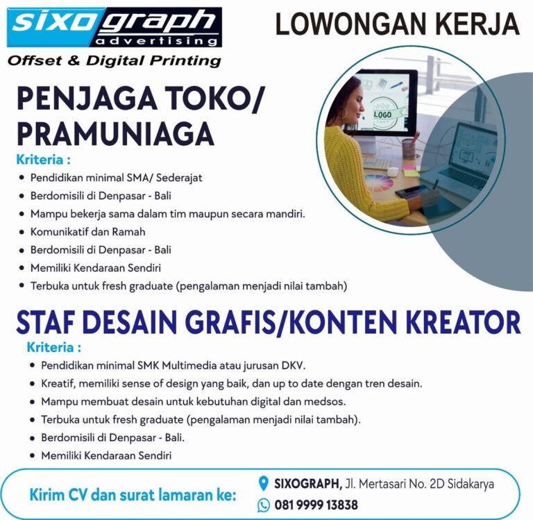 LOKER.BALINEWS.ID, DENPASAR — Sixograph Advertising membuka lowongan kerja untuk posisi Penjaga Toko/Pramuniaga serta Staf Desain Grafis/Konten Kreator. Kandidat yang dicari adalah individu komunikatif, ramah, mampu bekerja mandiri maupun dalam tim, serta berdomisili di Denpasar. Untuk posisi desain, pelamar diharapkan memiliki kreativitas tinggi, menguasai dasar desain multimedia, dan terbuka bagi lulusan baru yang siap berkembang di industri percetakan dan digital printing.
