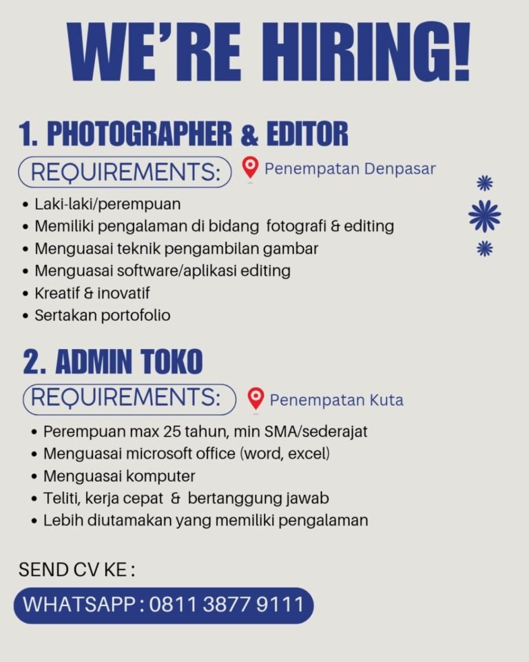 LOKER.BALINEWS.ID, DENPASAR – Sebuah usaha yang bergerak di bidang kreatif dan retail membuka lowongan kerja Bali untuk beberapa posisi, yaitu Photographer, Editor, dan Admin Toko dengan penempatan di wilayah Denpasar dan Kuta.