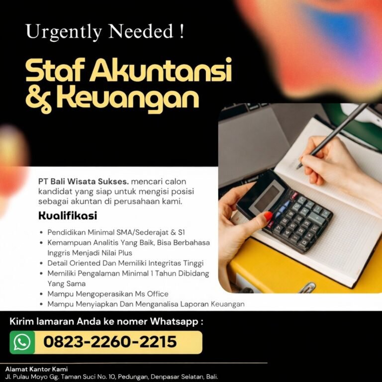 Bagi Anda yang berminat, berkas lamaran berupa Curriculum Vitae (CV) dapat dikirimkan langsung melalui pesan WhatsApp ke nomor +62 821-4566-8273. Kantor dan lokasi operasional Pitaloka berada di Jln. Batur Sari No. 90, Sanur Kauh, Denpasar. Informasi lebih lanjut mengenai profil perusahaan juga dapat dilihat melalui akun media sosial resmi mereka di @pitalokasanur.