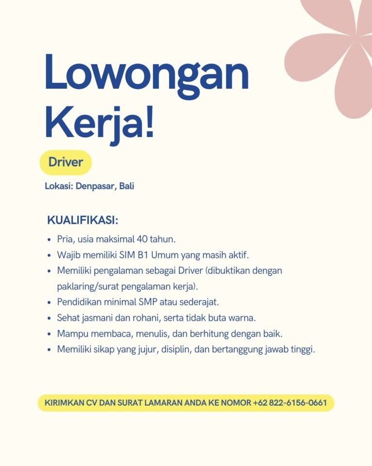 LOKER.BALINEWS.ID – Dibuka lowongan kerja terbaru di Bali untuk posisi Driver dengan penempatan di Denpasar. Kesempatan ini terbuka bagi kandidat pria dengan usia maksimal 40 tahun yang memiliki pengalaman kerja sebagai driver dan siap bekerja secara profesional.