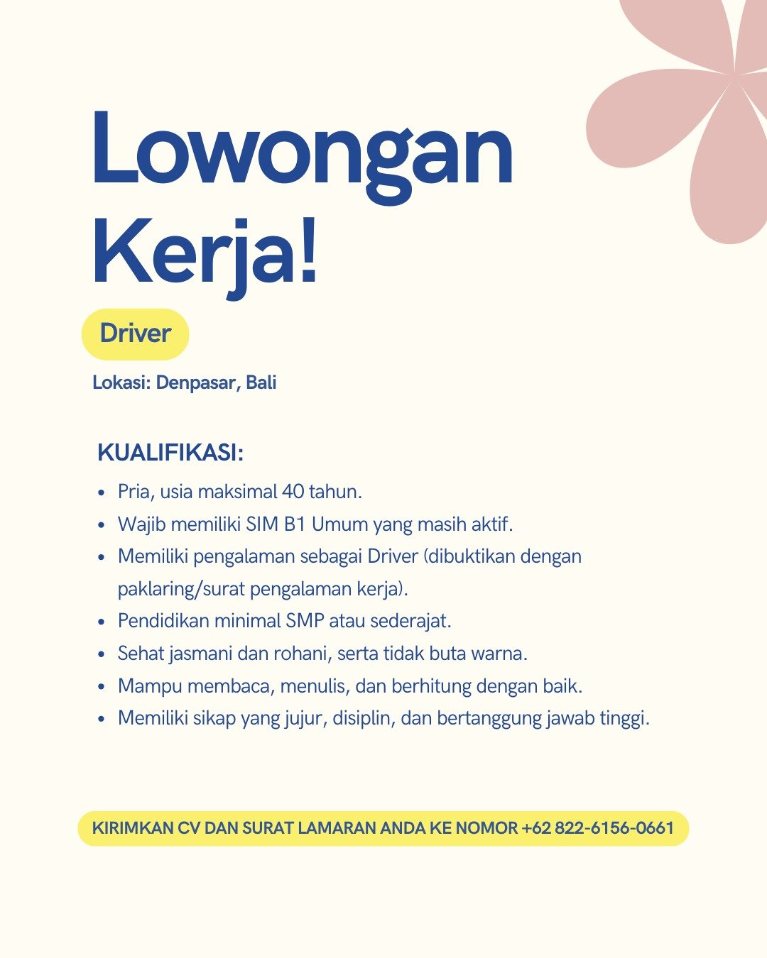 Pelamar wajib memiliki SIM B1 Umum yang masih aktif serta dapat membuktikan pengalaman kerja melalui paklaring atau surat pengalaman kerja. Pendidikan minimal SMP atau sederajat, sehat jasmani dan rohani, tidak buta warna, serta mampu membaca, menulis, dan berhitung dengan baik.