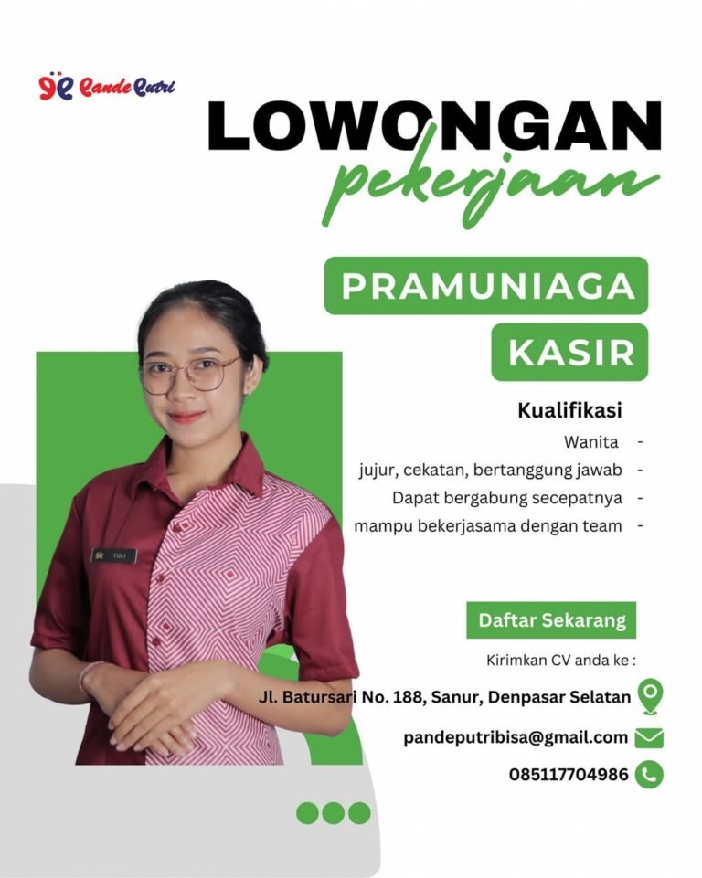 LOKER.BALINEWS.ID, DENPASAR — Cande Putri yang berlokasi di Jalan Batursari No. 188, Sanur, membuka Lowongan Kerja Bali Pramuniaga, Kasir, dan Kitchen Bakery di Cande Putri guna memperkuat tim operasional toko. Rekrutmen ini menyasar kandidat yang siap bergabung segera, jujur, cekatan, dan mampu bekerja sama dalam tim.