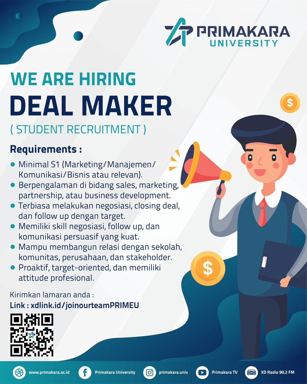 LOKER.BALINEWS.ID, DENPASAR – Primakara University, salah satu institusi pendidikan tinggi terkemuka di Bali, saat ini sedang membuka kesempatan karir bagi tenaga profesional yang kompeten untuk mengisi posisi Deal Maker dalam tim Student Recruitment. Lowongan ini terbuka bagi individu yang memiliki latar belakang pendidikan minimal S1 di jurusan Marketing, Manajemen, Komunikasi, Bisnis, atau bidang relevan lainnya. Kandidat yang dicari adalah mereka yang sudah berpengalaman di bidang sales, marketing, partnership, atau business development, serta terbiasa melakukan negosiasi dan closing deal sesuai dengan target yang ditetapkan oleh universitas.