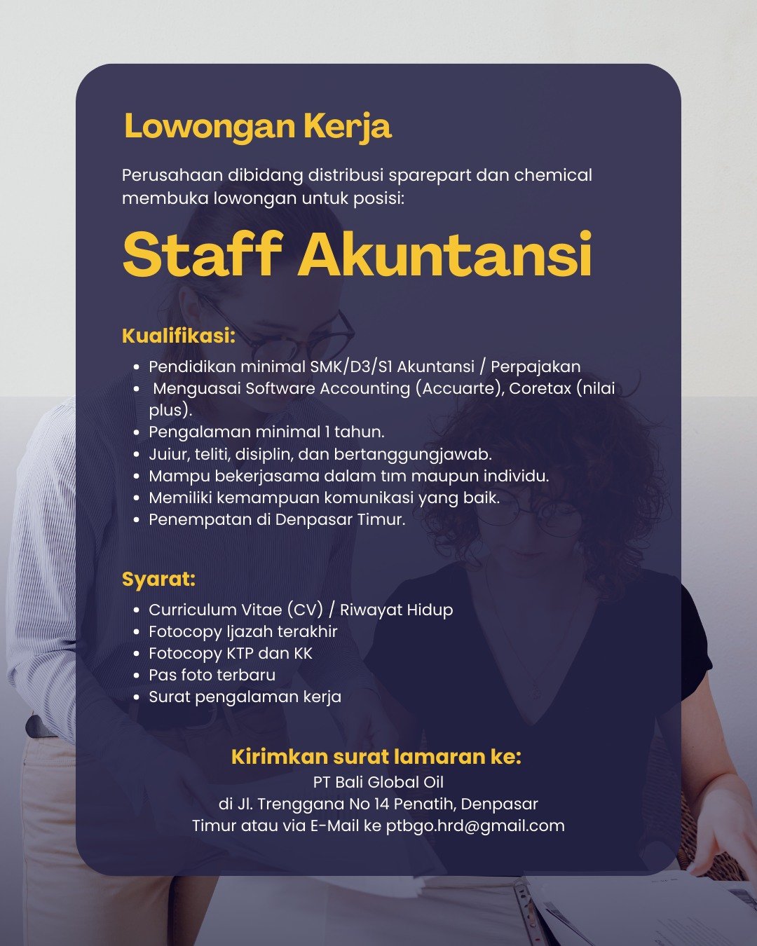 LOKER.BALINEWS.ID, DENPASAR – Kabar gembira bagi para pencari kerja di wilayah Bali, khususnya bagi tenaga profesional di bidang keuangan. PT Bali Global Oil, sebuah perusahaan yang bergerak di bidang distribusi sparepart dan chemical, secara resmi mengumumkan pembukaan lowongan kerja untuk mengisi posisi Staff Akuntansi. Perusahaan ini mencari kandidat yang memiliki ketelitian tinggi serta tanggung jawab dalam mengelola administrasi keuangan perusahaan untuk ditempatkan di kantor cabang Denpasar Timur.