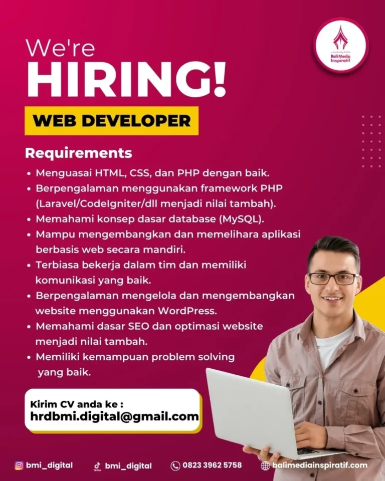 LOKER.BALINEWS.ID, BALI – PT Bali Media Inspiratif, perusahaan yang bergerak di bidang media dan digital, saat ini sedang membuka kesempatan berkarir bagi tenaga profesional IT untuk mengisi posisi Web Developer. Perusahaan mencari individu yang kompeten dalam membangun dan memelihara aplikasi berbasis web secara mandiri, serta memiliki kemampuan pemecahan masalah (problem solving) yang baik.