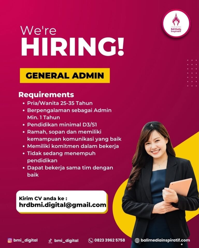 LOKER.BALINEWS.ID, BALI – PT Bali Media Inspiratif, sebuah perusahaan yang bergerak di bidang media dan kreatif, saat ini sedang membuka peluang karir bagi para profesional untuk mengisi posisi General Admin. Lowongan ini terbuka bagi pria maupun wanita dengan rentang usia 25 hingga 35 tahun yang memiliki komitmen tinggi dalam bekerja. Perusahaan mencari kandidat yang memiliki kemampuan komunikasi yang baik, ramah, sopan, serta mampu bekerja sama di dalam tim untuk mendukung operasional harian kantor.