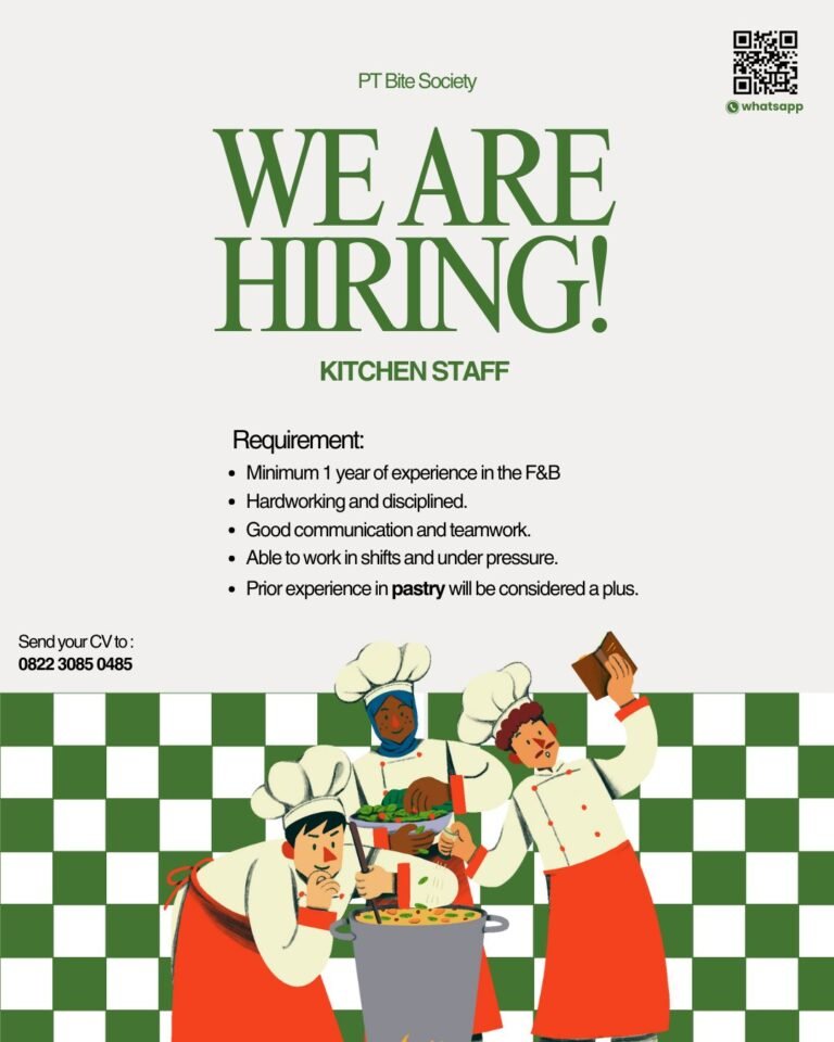 LOKER.BALINEWS.ID, DENPASAR – PT Bite Society, sebuah perusahaan yang bergerak di bidang kuliner di Bali, secara resmi membuka kesempatan karir bagi para profesional dapur untuk bergabung dalam tim mereka. Saat ini, perusahaan sedang mencari kandidat yang berdedikasi tinggi untuk mengisi posisi sebagai Kitchen Staff guna mendukung operasional harian dan menjaga standar kualitas penyajian makanan. Langkah rekrutmen ini dilakukan untuk memperkuat struktur tim produksi makanan agar tetap mampu memberikan pelayanan terbaik bagi pelanggan.