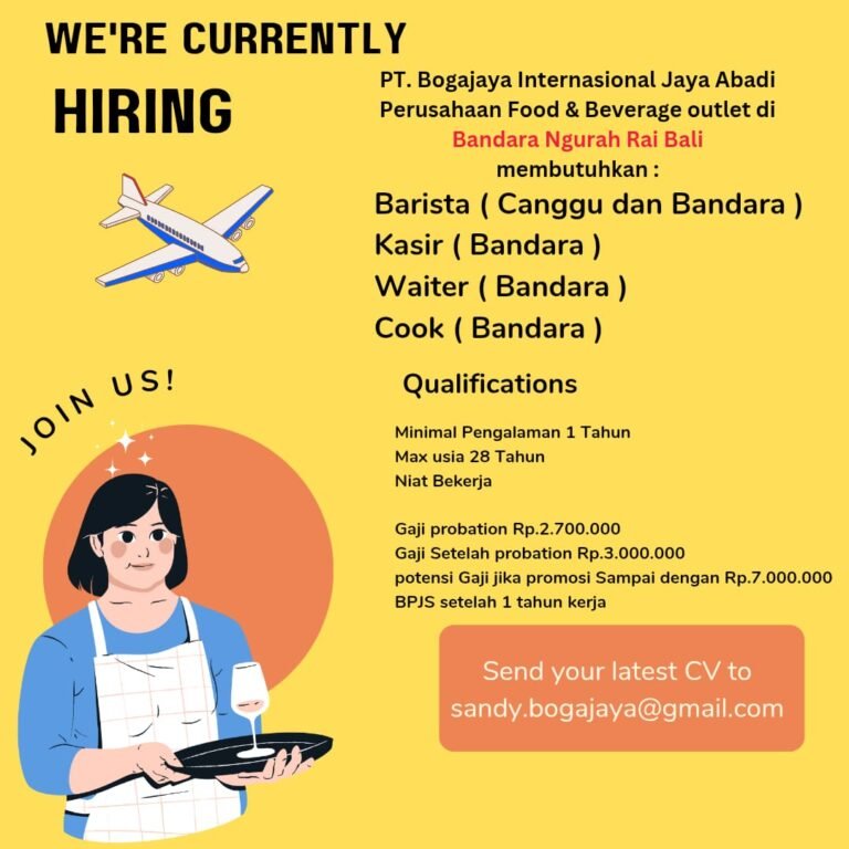 LOKER.BALINEWS.ID, BADUNG – PT Bogajaya Internasional Jaya Abadi, perusahaan yang bergerak di bidang Food & Beverage dan mengelola outlet di kawasan Bandara Ngurah Rai Bali serta wilayah Canggu, membuka peluang kerja untuk beberapa posisi sekaligus. Lowongan yang tersedia meliputi Barista (Canggu dan Bandara), Kasir, Waiter, serta Cook. Perusahaan mencari kandidat berpengalaman minimal satu tahun, berusia maksimal 28 tahun, dan memiliki kemauan kerja yang tinggi.