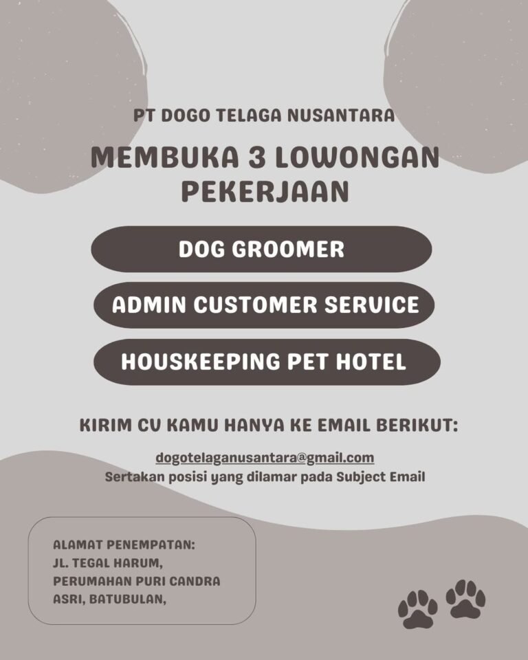 LOKER.BALINEWS.ID, GIANYAR – PT Dogo Telaga Nusantara secara resmi mengumumkan pembukaan lowongan pekerjaan bagi masyarakat Bali yang memiliki kecintaan terhadap hewan, khususnya anjing. Perusahaan yang bergerak di bidang perawatan hewan ini sedang mencari kandidat yang energik untuk mengisi tiga posisi strategis, yaitu Dog Groomer, Admin Customer Service, dan Housekeeping Pet Hotel. Seluruh posisi tersebut akan ditempatkan di area Batubulan, tepatnya di Jl. Tegal Harum, Perumahan Puri Candra Asri.