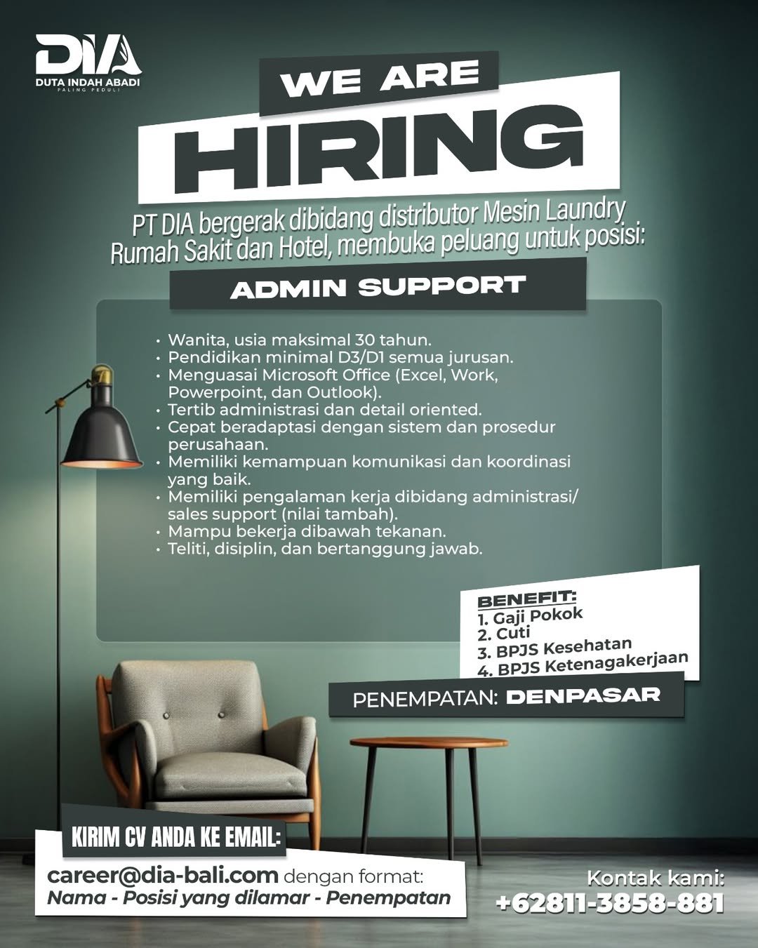 LOKER.BALINEWS.ID, DENPASAR — PT Duta Indah Abadi, perusahaan distributor mesin laundry untuk Rumah Sakit dan Hotel, membuka peluang karier untuk posisi Staff Logistik dan Admin Support.