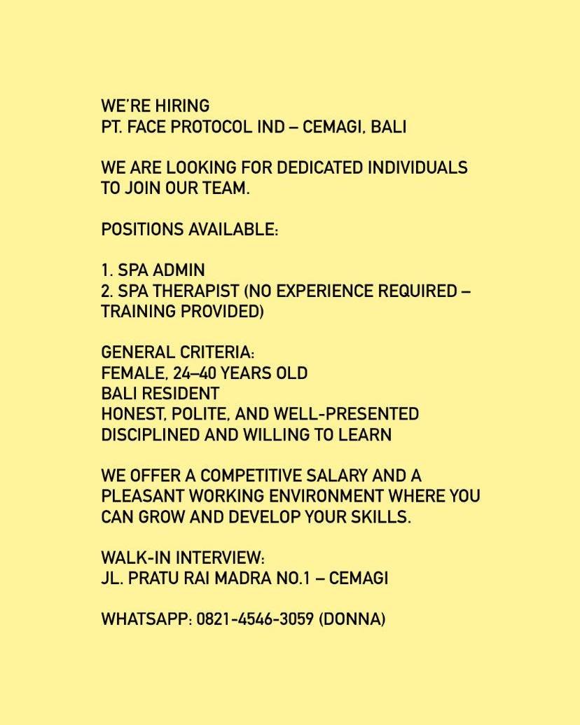 LOKER.BALINEWS.ID, BADUNG – PT Face Protocol Indonesia yang berlokasi di kawasan Cemagi saat ini sedang membuka kesempatan karir bagi individu yang berdedikasi untuk bergabung dalam tim mereka. Perusahaan jasa kecantikan dan kebugaran ini menawarkan dua posisi utama, yaitu SPA Admin dan SPA Therapist. Menariknya, untuk posisi SPA Therapist, pihak perusahaan tidak mewajibkan pengalaman kerja sebelumnya karena akan disediakan pelatihan khusus bagi kandidat yang terpilih. PT Face Protocol Indonesia menjanjikan paket gaji yang kompetitif serta lingkungan kerja yang menyenangkan untuk mendukung pengembangan keterampilan setiap karyawannya.