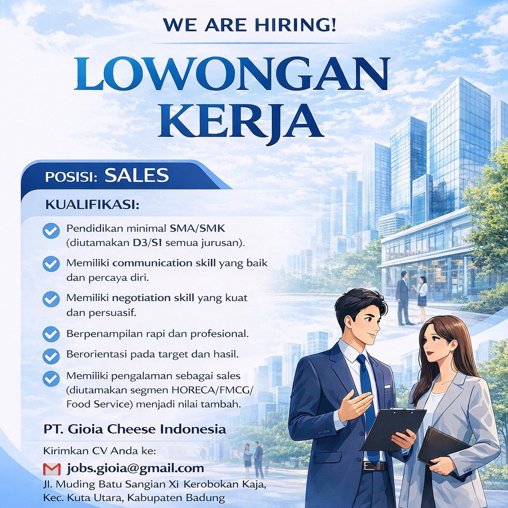 LOKER.BALINEWS.ID, BADUNG – PT. Gioia Cheese Indonesia, perusahaan yang bergerak di industri pengolahan keju, saat ini tengah membuka kesempatan karir bagi individu yang kompeten untuk mengisi posisi Sales. Perusahaan yang beralamat di Jalan Muding Batu Sangian XI, Kerobokan Kaja, Kecamatan Kuta Utara, Kabupaten Badung ini, mencari kandidat yang berorientasi pada target dan hasil untuk memperkuat tim pemasaran mereka.