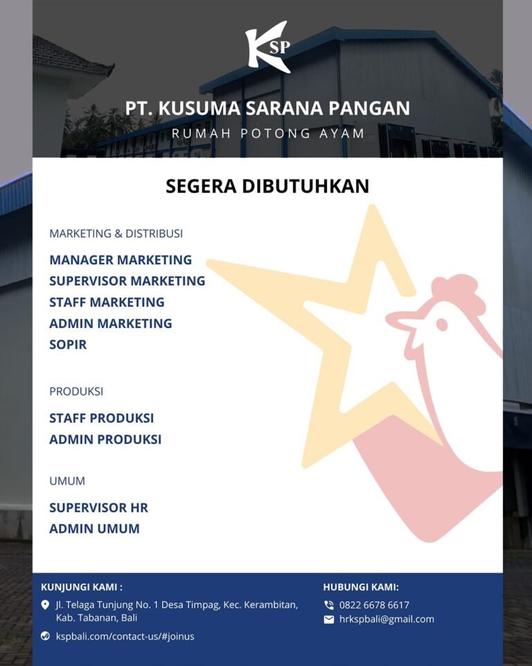 LOKER.BALINEWS.ID, TABANAN — PT Kusuma Sarana Pangan (Rumah Potong Ayam) kembali membuka kesempatan bagi para pencari kerja yang ingin bergabung di sektor industri pangan. Perusahaan yang berlokasi di Desa Timpag, Kecamatan Kerambitan, Tabanan ini membuka beberapa posisi strategis di bidang marketing & distribusi, produksi, hingga administrasi dan sumber daya manusia. Adapun posisi yang tersedia meliputi Manager Marketing, Supervisor Marketing, Staff Marketing, Admin Marketing, Sopir, Staff Produksi, Admin Produksi, Supervisor HR, serta Admin Umum.