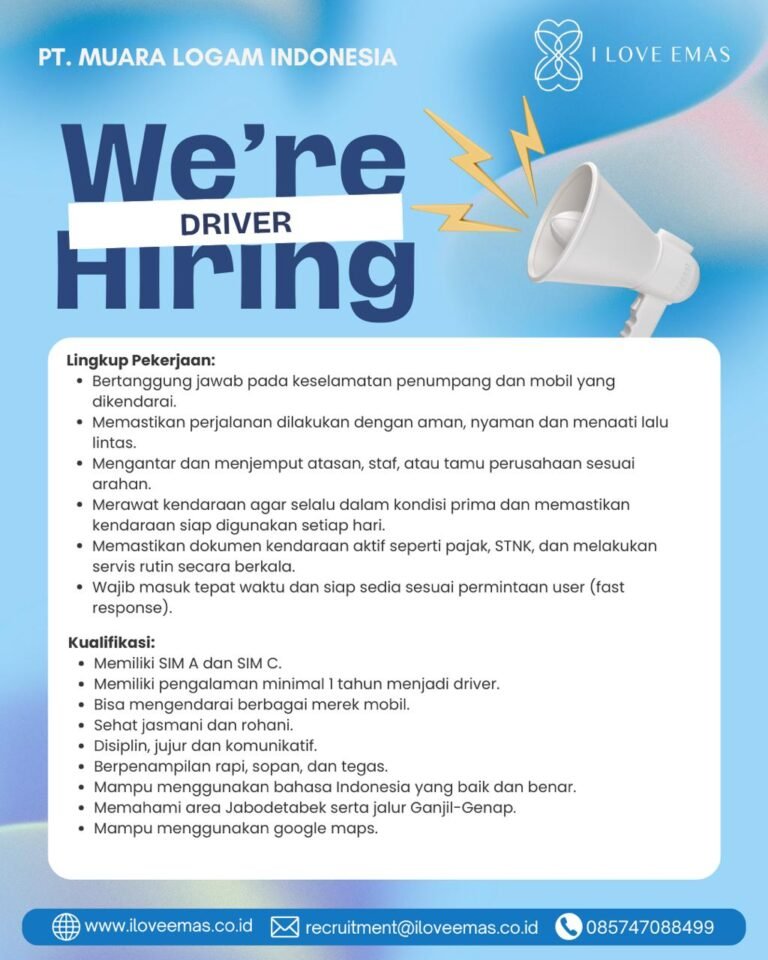 LOKER.BALINEWS.ID – PT. Muara Logam Indonesia, perusahaan yang beroperasi di bawah brand I Love Emas, kembali membuka peluang kerja untuk tiga posisi strategis: Driver, Japanese Interpreter, dan Operational Staff. Rekrutmen ini dilakukan untuk memperkuat tim operasional perusahaan yang terus berkembang.