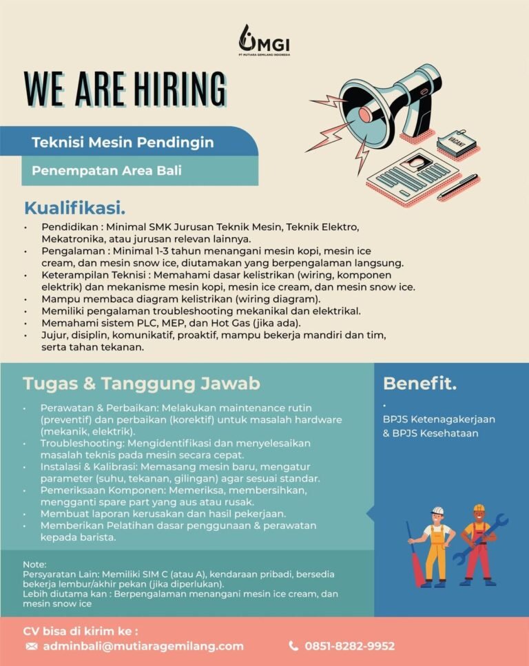 Kualifikasi yang dibutuhkan mencakup pendidikan minimal SMK jurusan Teknik Mesin, Elektro, atau Mekatronika, dengan pengalaman kerja minimal 1–3 tahun menangani mesin pendingin atau peralatan kopi. Calon pelamar diwajibkan memahami dasar kelistrikan (wiring diagram) serta memiliki pengalaman dalam troubleshooting mekanikal maupun elektrikal. PT MGI menawarkan benefit berupa BPJS Ketenagakerjaan dan BPJS Kesehatan bagi kandidat yang lolos seleksi. Berkas lamaran dapat dikirimkan melalui email ke adminbali@mutiaragemilang.com atau melalui WhatsApp di nomor 0851-8282-9952.