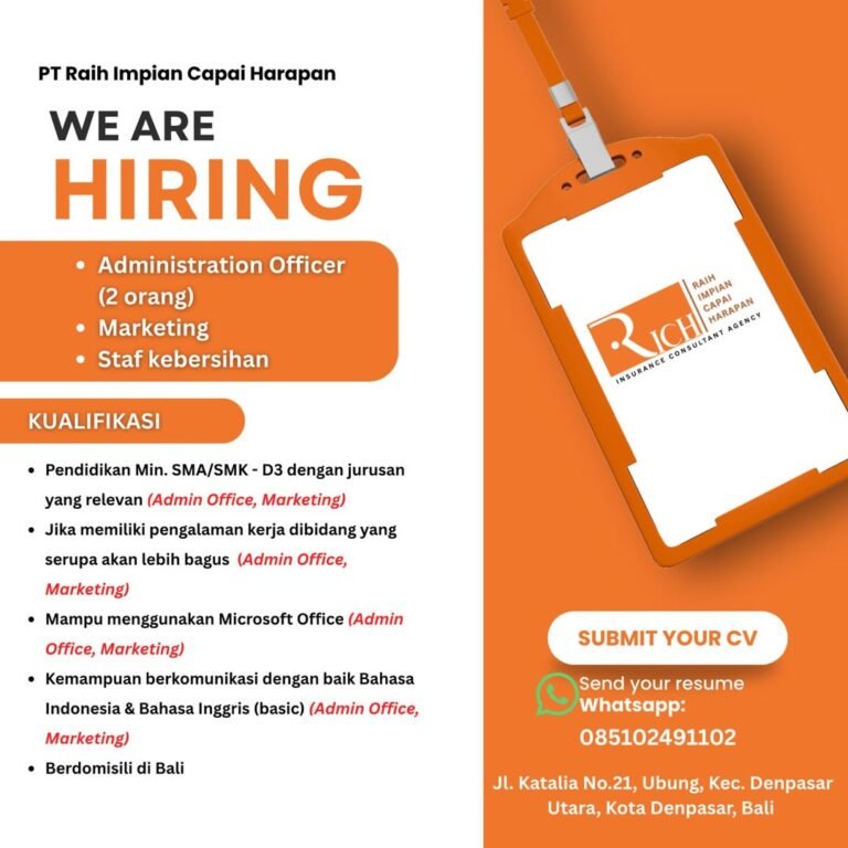 LOKER.BALINEWS.ID, DENPASAR – PT Raih Impian Capai Harapan, sebuah agen konsultan asuransi yang berlokasi di wilayah Ubung, saat ini sedang membuka kesempatan berkarier bagi masyarakat lokal di Bali. Perusahaan membutuhkan tenaga kerja baru untuk mengisi beberapa posisi strategis, yaitu Administration Officer (2 orang), Marketing, dan Staf Kebersihan. Kantor pusat operasionalnya sendiri beralamat di Jl. Katalia No. 21, Ubung, Kecamatan Denpasar Utara, Kota Denpasar.