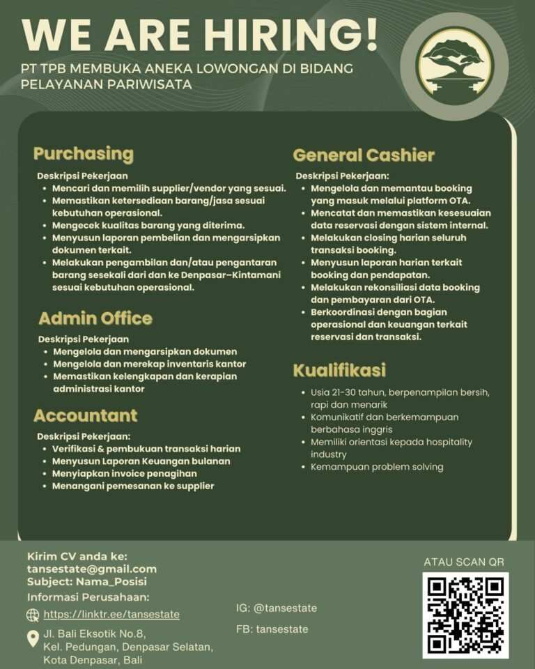 LOKER.BALINEWS.ID, DENPASAR – PT Tanaya Pesona Batur (PT TPB), sebuah perusahaan yang bergerak di bidang pelayanan pariwisata, saat ini sedang membuka kesempatan karir bagi individu-individu berbakat di Bali. Perusahaan tengah mencari kandidat untuk mengisi beberapa posisi kunci, yaitu Purchasing, Admin Office, Accountant, dan General Cashier. Setiap posisi memiliki tanggung jawab spesifik, mulai dari manajemen stok dan vendor untuk bagian Purchasing, hingga pengelolaan reservasi melalui platform OTA bagi posisi General Cashier. Seluruh operasional ini dipusatkan untuk mendukung standar pelayanan tinggi di industri hospitality.