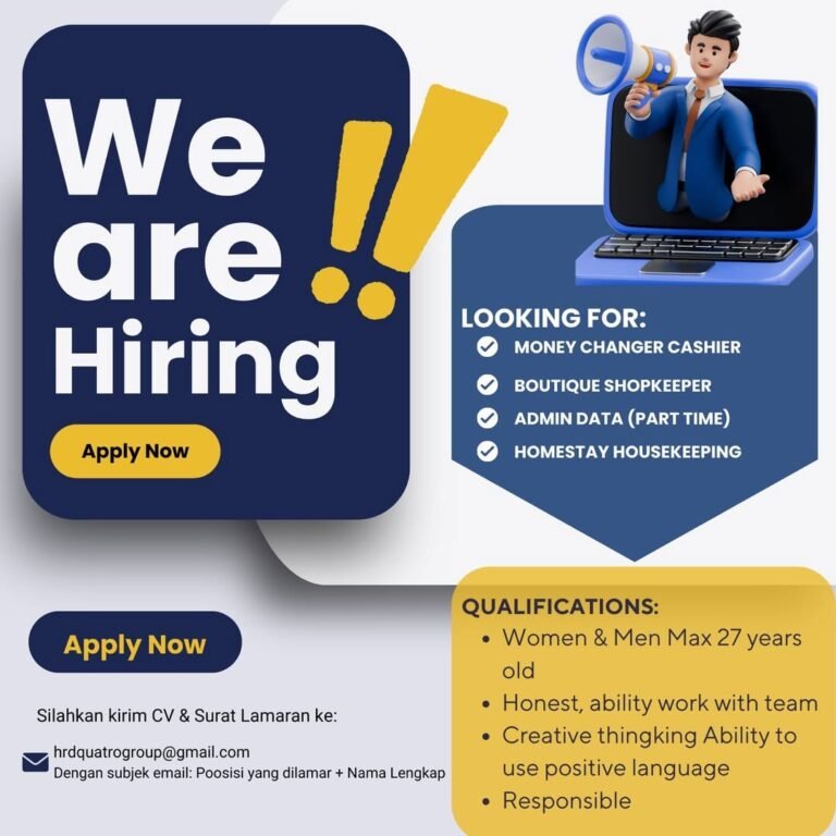 LOKER.BALINEWS.ID, BALI – Peluang karier yang luas kini hadir bagi masyarakat di Bali melalui pembukaan lowongan kerja dari Quatro Group. Perusahaan saat ini sedang mencari tenaga kerja potensial untuk mengisi empat posisi berbeda, yaitu Money Changer Cashier, Boutique Shopkeeper, Admin Data (Part Time), dan Homestay Housekeeping. Variasi posisi yang ditawarkan ini memberikan kesempatan bagi pencari kerja dengan berbagai latar belakang keahlian untuk bergabung dan berkembang bersama grup perusahaan yang dinamis ini.