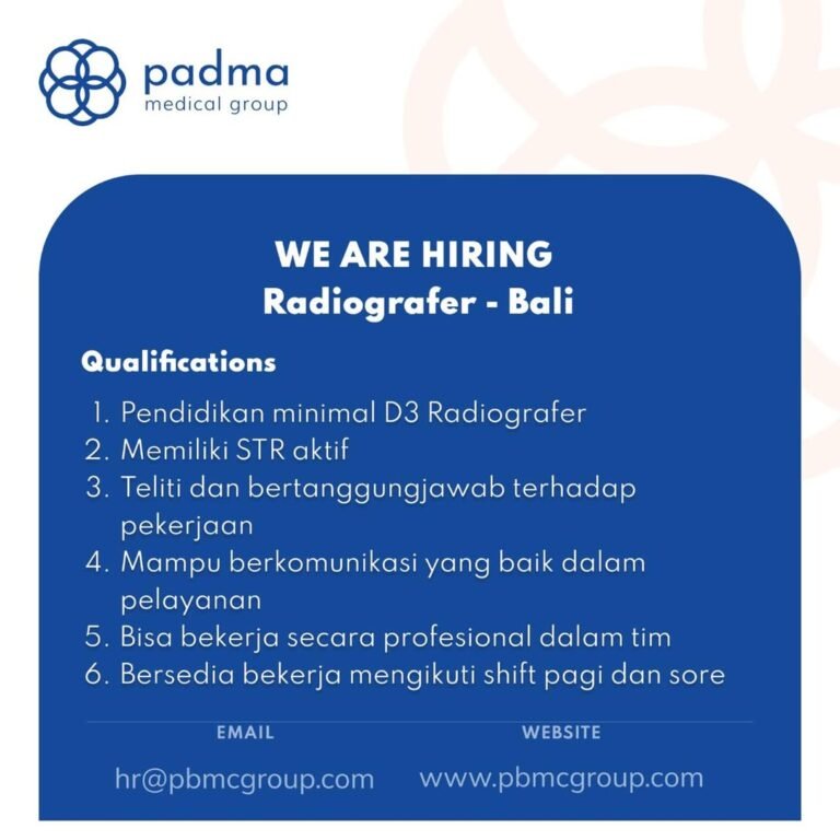 LOKER.BALINEWS.ID, DENPASAR — Padma Medical Group membuka Lowongan Kerja Bali Radiografer bagi tenaga profesional yang memiliki kualifikasi pendidikan minimal D3 Radiografer dan STR aktif. Posisi ini menuntut ketelitian, tanggung jawab tinggi, serta kemampuan bekerja sesuai standar pelayanan medis. Kandidat diharapkan mampu memberikan pelayanan yang komunikatif dan profesional kepada pasien.