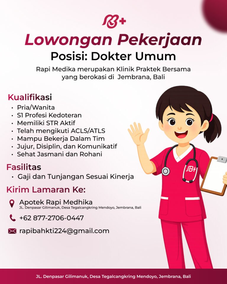 LOKER.BALINEWS.ID, JEMBRANA – Klinik Praktek Bersama Rapi Medhika yang berlokasi di Kabupaten Jembrana sedang membuka kesempatan karir bagi para profesional medis. Saat ini, klinik tersebut membutuhkan tenaga Dokter Umum yang berdedikasi untuk memberikan pelayanan kesehatan berkualitas bagi masyarakat sekitar. Lowongan ini terbuka bagi pria maupun wanita yang memiliki kualifikasi pendidikan S1 Profesi Kedokteran serta memiliki STR (Surat Tanda Registrasi) yang masih aktif.