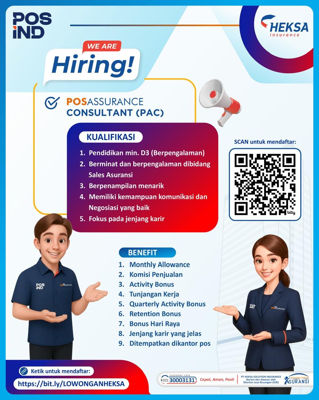 Melalui program rekrutmen Lowongan Kerja Bali ini, perusahaan menawarkan berbagai benefit kompetitif seperti komisi penjualan, monthly allowance, activity bonus, annual bonus, tunjangan hari raya, BPJS kesehatan dan ketenagakerjaan, hingga jenjang karier yang jelas. Seluruh kandidat akan mendapatkan pelatihan berkala untuk mendukung pengembangan kemampuan di lapangan. Bagi profesional yang ingin berkembang di industri asuransi dan siap mengambil tantangan baru, peluang ini menjadi kesempatan emas untuk bergabung dan ditempatkan di outlet kantor pos di wilayah Bali.